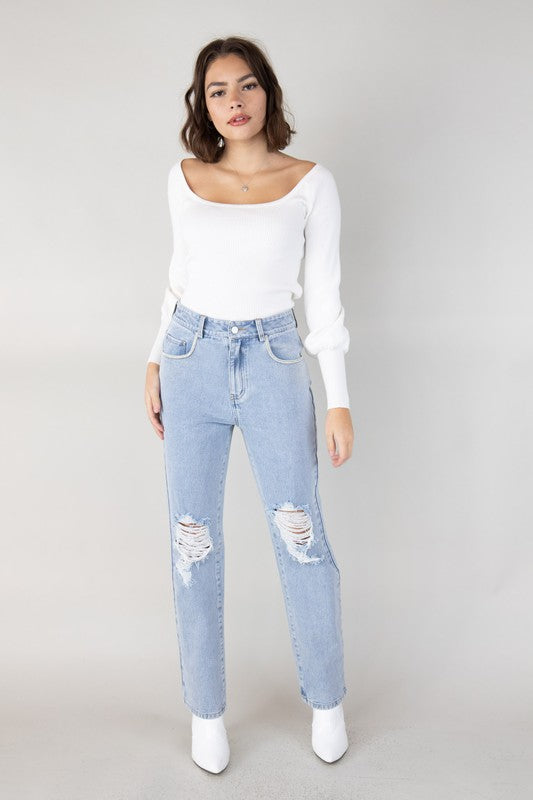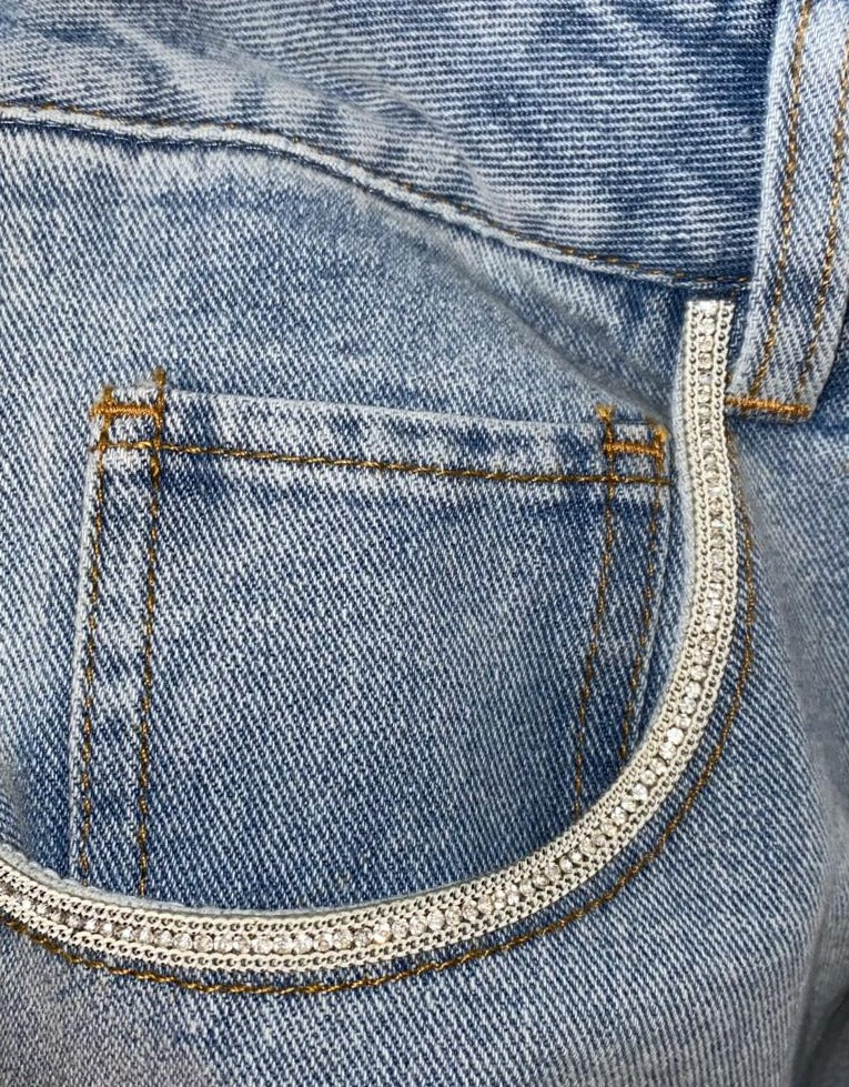 These luxury-inspired jeans bring high-class to street fashion. Engraved crystal trim line the side pockets for a subtle, yet expensive look. Made in our durable light wash denim with distressed knee rips. High-waisted fit with a trendy straight leg. Pair with any basic top for a cute, classy, and comfortable look.